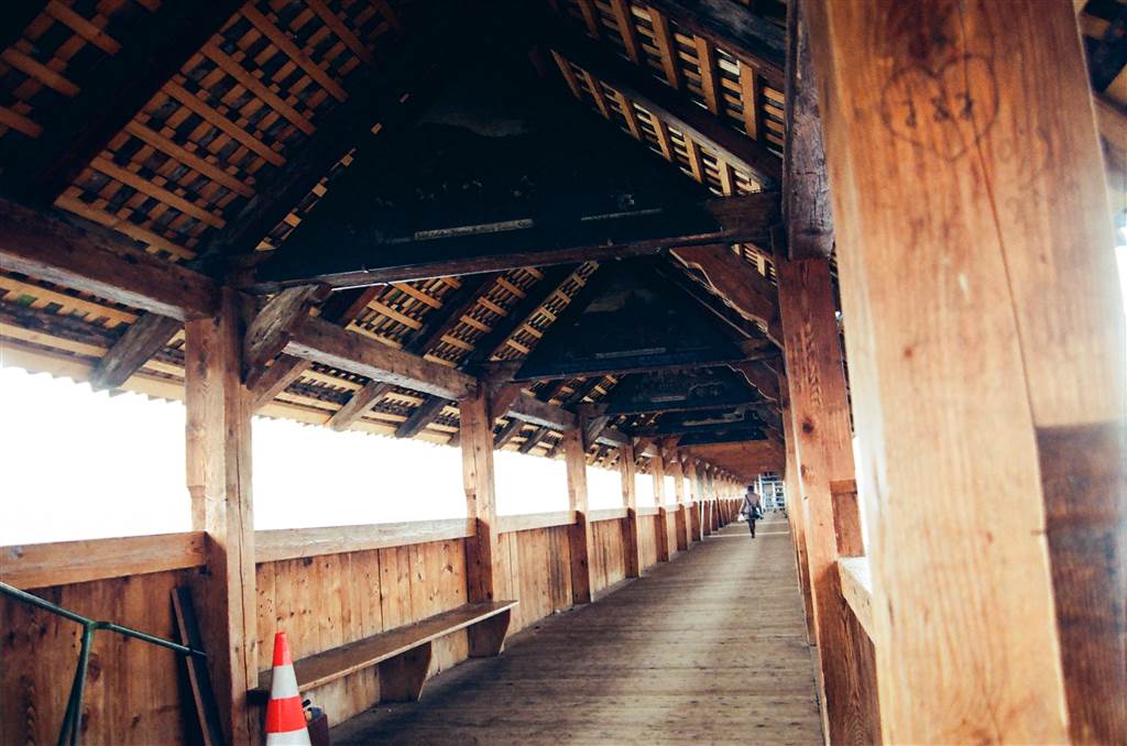 I could not resist the urge to walk it.  Contrary to my expectations, the wooden bridge did not squeak beneath my feet.  The Chapel Bridge of the 14th century was part of the fortification against attacks from River Reuss.  It is the oldest wooden bridge in Europe.  The Wasserturm, as an octagonal water tower, once served as a lighthouse, a treasury and a prison.  As with the other bridge that I was soon to cross, there are paintings on the roof panels of the bridge.  On the Chapel Bridge, these paintings depict the history of Luzern.  I learned from the guidebook that a fire in 1993 has partly destroyed the bridge, and there was work to restore all of it, including the paintings.  No wonder it did not squeak, ancient as it was.