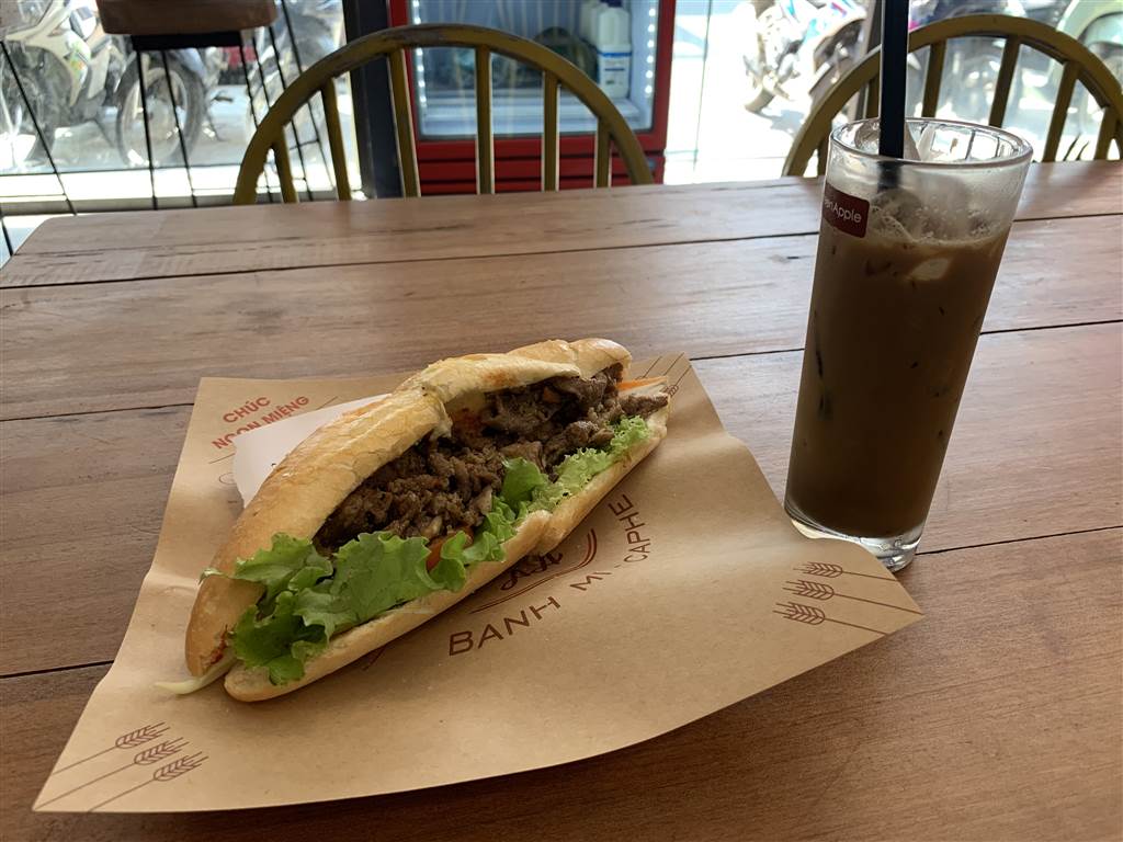 On this first morning in Danang I had coffee, worked a bit more, and had lunch at the Happy Bread 76 – Mi AA downstairs from the hostel. The banh-mi (Vietnamese sandwich) came in just the right proportions between the meat and the veggies. Since Vietnamese coffee was irresistible, I had my second cup there.