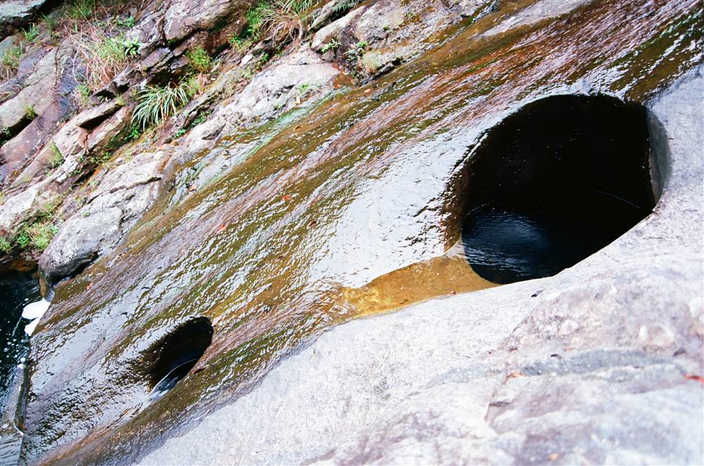 These potholes come about due to water erosion of granite, sandstone or conglomerate surfaces. The water carries small pieces of sediments. As the stream passes through, the sediments in the water swirl and slowly erode the granite, and these potholes form. The holes then become a well due to consistent erosion, each well collecting the flowing water. Some are deep enough to allow a whole person to submerge in. Indeed, at Shek Pan Tam, many visitors would dip their whole bodies into the potholes for a nice bath.