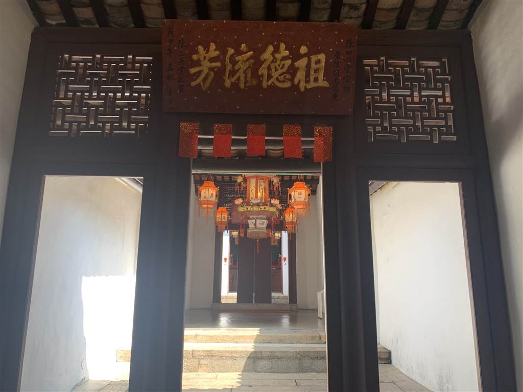 This end gate at the Assembly Hall serves to ward off the evil forces.  It protects the village from disasters.  As such, the gate remains closed for usual days except for very special occasions.  Above the gate is set a plaque of honor that the Qing Court gifted to Chan Kin-Sheung.  It recognizes his significant contribution to charity and the community.  The words mean “Greatly-Respected Patriarch.”  Currently on display is a replica of the 1980s.  The original was long ago beyond repairs.