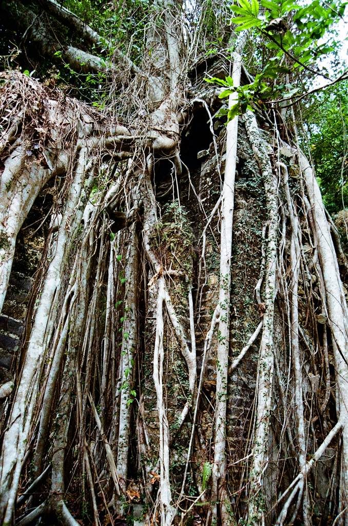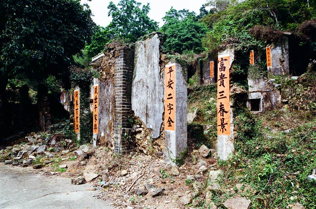 Yet this clear human presence in the ruins accentuates the eeriness, perhaps unexpectedly so. In the hollows behind the mere facades that remain of these houses, old banyan trees with their overgrown aerial roots bespeak decades of abandonment. If the rumors are that people discovered untouched food on dining tables with all villagers gone, then the newly-posted couplets embody the same theme: traces of human activity in a wholly-vacated village.