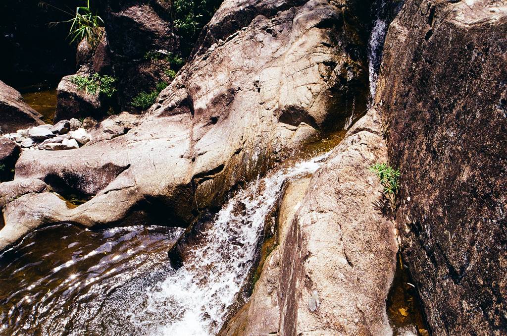 With the rapids washing your whole body (and the beautiful sound of water splashing all around you), there is almost no mind power left to watch your feet. So I kind of felt my way with my feet, without knowing what the next step might be. Needless to say, you can easily lose balance on a single rope and slippery cliff surfaces. When I did, it took first the left hand to prevent my body from banging on the cliff and sustaining bruises. Then I told myself to seriously calm down before the next move, at the same time reminding my right hand that it must not let go. Then I exercised strength in the waist and the knees to get my feet back on the cliff, and facing the cliff in a half-squat to continue the descent properly.