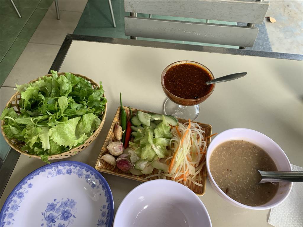 The Nem Lui is a grilled pork skewer on lemongrass sticks.  When served, you wrap it with fresh veggies, herbs and chilli in a piece of rice paper.  Then you dip it in the wonderful sauce that comes with it.  One serving came with five skewers. I furthermore went all out with the veggie wrapping.  The skewers ended up with big rice paper packets in generous dipping sauce.