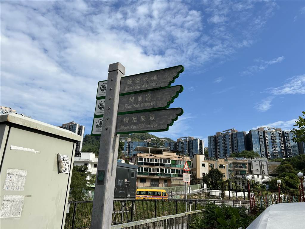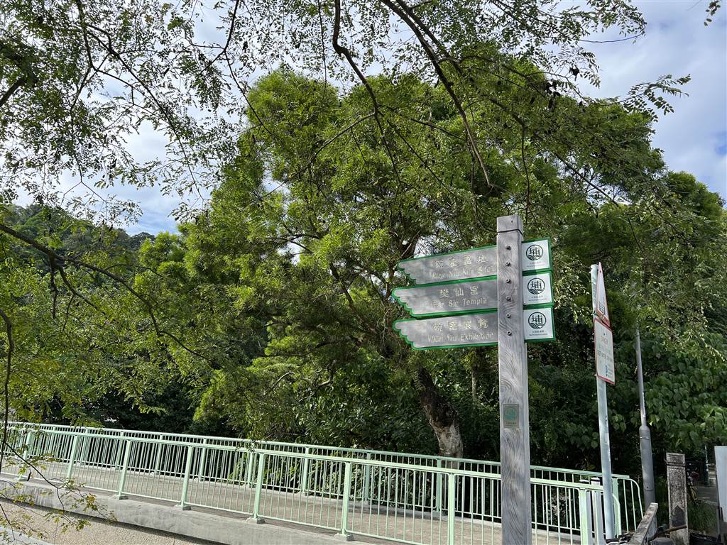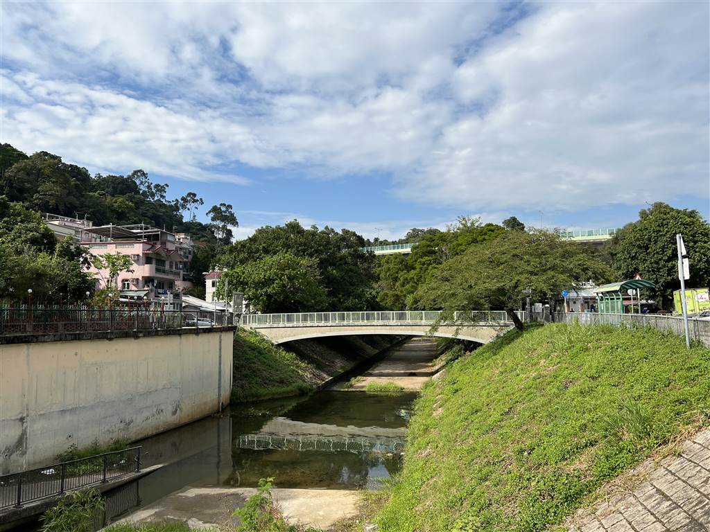Green top minibus Route 23K runs between the Tai Po Market Station and Wun Yiu.  Get off at the Wun Yiu stop, then cross the street.  You will see these following views, with the aqueduct and the bridge.  Cross the bridge, and you will see the signs pointing to the Wun Yiu Exhibition and the Fan Sin Temple.