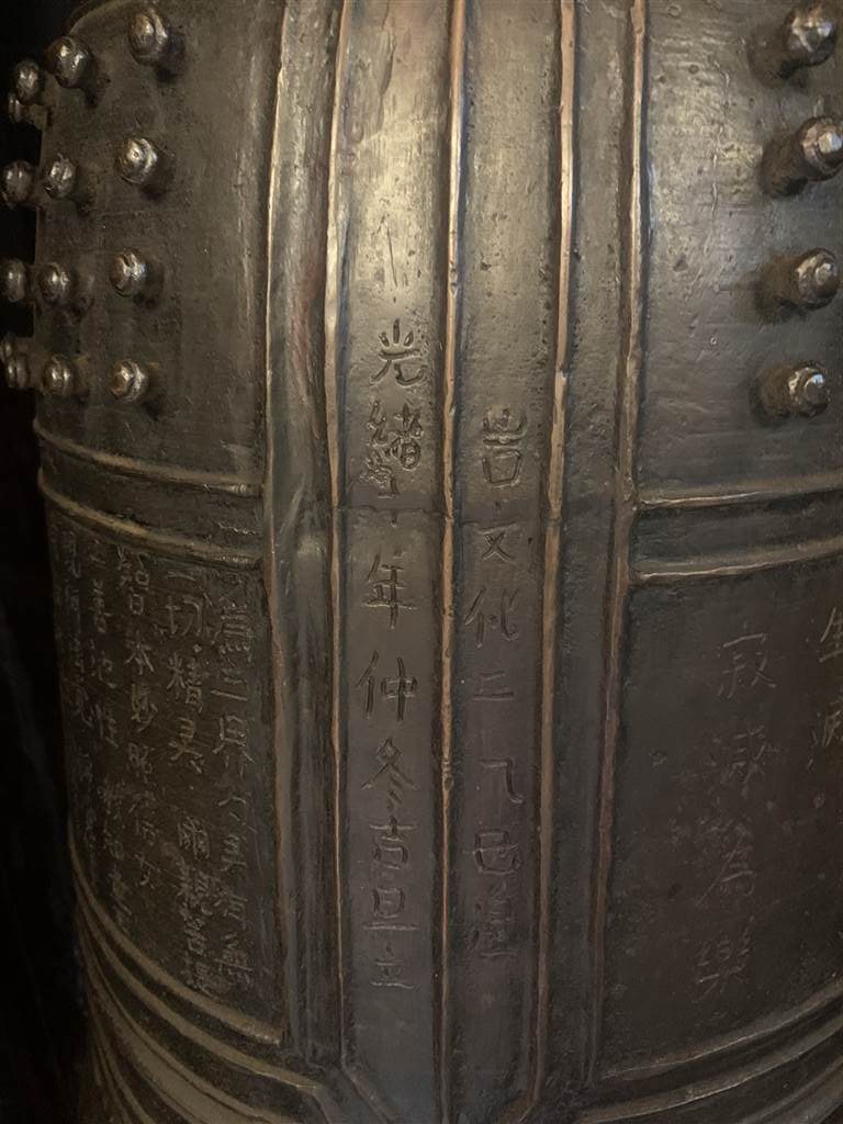 The brass bell has some interesting features. The surface shows the date of the bell in engraving. There are four columns of embossed buttons on its upper part. According to my research, this feature resembles the brass chimes of the Warring State Period (bianzhong). They used to be percussion instruments in ancient China.