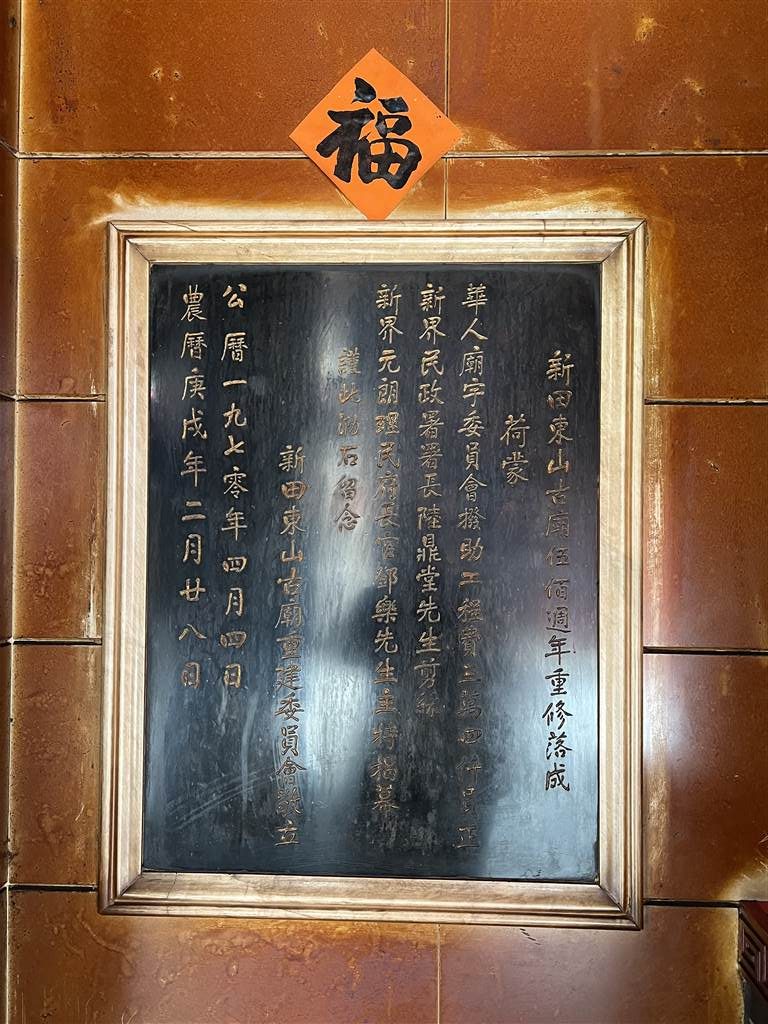 Tung Shan is the name of Man Tin-shui, the descendants of whom established the Man villages in San Tin of Yuen Long.  Originally, Tung Shan Temple was a Tin Hau Temple.  After its restoration in 1905, the temple was dedicated to the original ancestor Man Tin-shui, as such it acquired the name Tung Shan Temple.