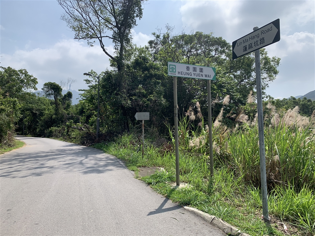 Photos: Left – The pavilion on Lin Ma Hang Road, at the entrance to Heung Yuen Wai Village.  Right – Once off the minibus, follow Lin Ma Hang Road.
