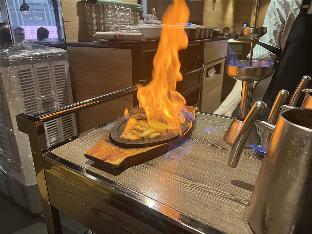 The Beef Brochette Flambé adds a touch of theatrics to the common steak on sizzling hot plate. The beef comes first in a skewer. Then the waiter sets the meat on flames. The flames is induced by rose wine. Besides its dramatic visuals, this step, in its culinary intention, serves to introduce the fragrance of wine into the beef. As the meat is moved onto the sizzling hot plate, the flames catches on.