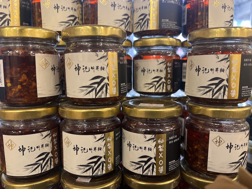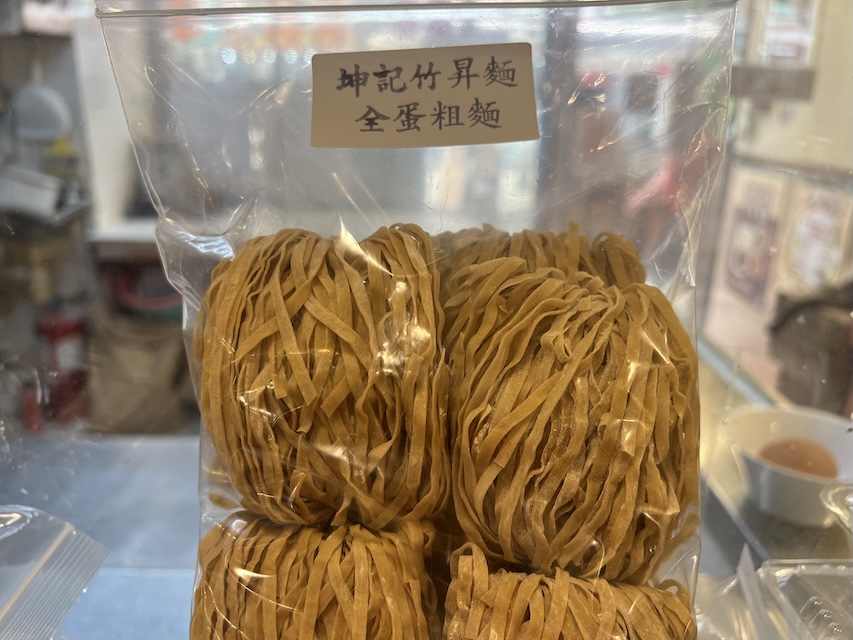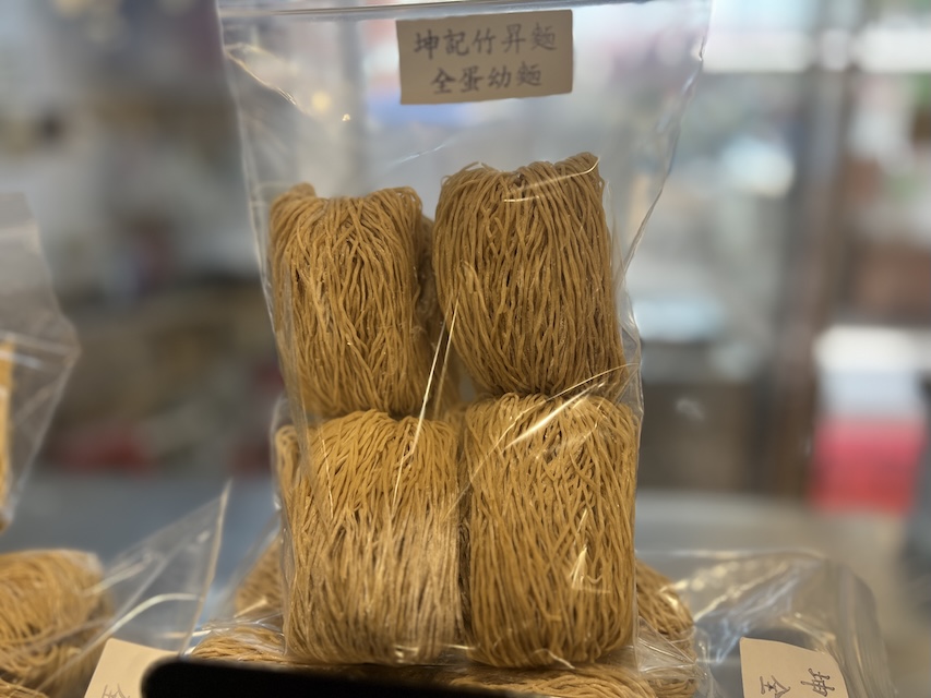 The name “zuk sing noodle,” meaning “bamboo-raised,” comes from the technique that requires the use of a long bamboo staff in pressing the noodles. In Cantonese, a bamboo staff is pronounced “zuk gon” and the character “gon” rhymes with the word for “lowering.” As such it does not bode well for business. It then became a convention to change “gon” into “sing,” which means “rising” or “raised.” The name “zuk sing” then has the literal meaning of “raised by a bamboo.”