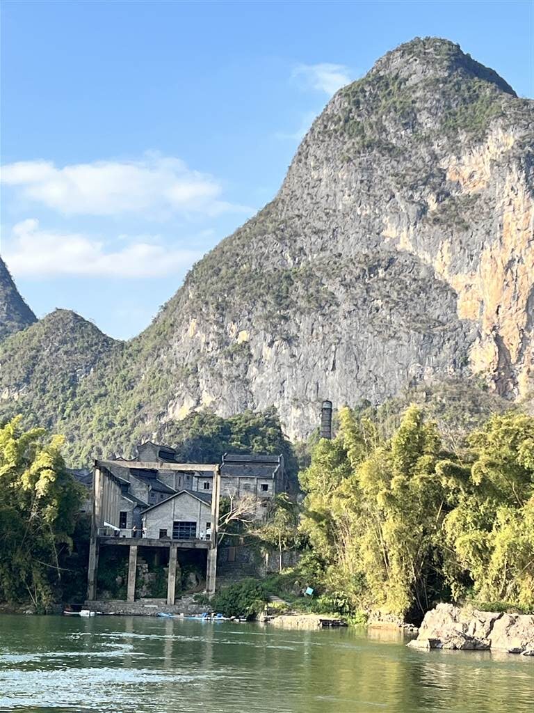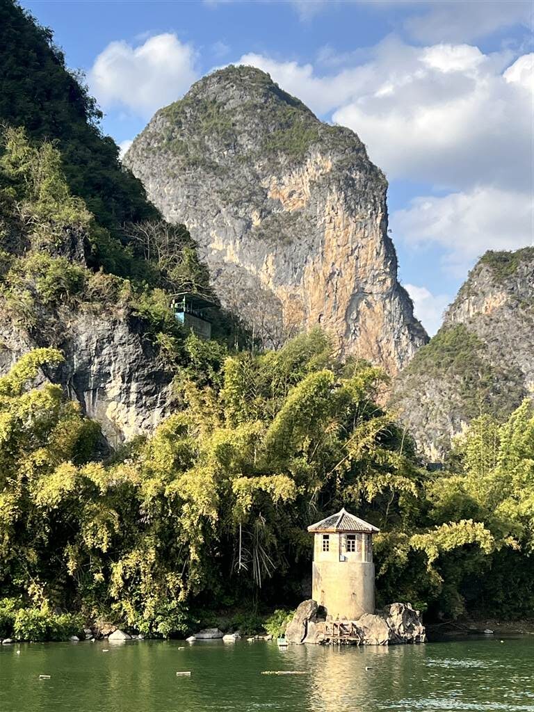 About 20 minutes after the boat departed from the pier, we were able to go up to the deck and feel the embrace of the peak clusters all around us, rolling on endlessly above the meandering river. Surely, the natural beauty of Lijiang was an incredibly pleasing sight, but I found the occasional human footprint to add an interesting touch to the natural scenery. We saw some fishing boats, some town establishments afar, and some interesting structures by the shore as well.