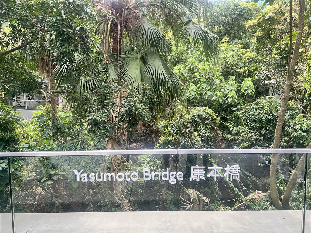 The Yasumoto Bridge is intended to be an ecological walkway, where pedestrians will enjoy bird viewing and their singsongs with the urban views of Hong Kong island on the side. On the hillside, the original fan palms there were preserved and new ones were planted to serve as a habitat for the short-nosed fruit bat. These fruit bats are seen at dusk.