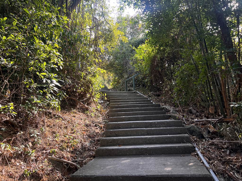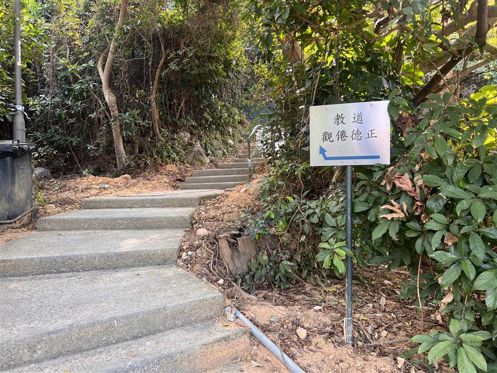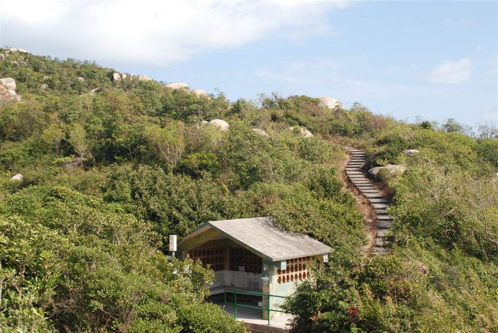 The hike up the mountains was done on a nice-paved trail throughout. At the Tin Hau Temple, there is a large open space. One shows a set of stairs up, and the other goes toward the Kamikaze grottos. While the level road will lead you to Yung Shue Wan, I wanted to see the mountains in Sok Kwu Wan so you would be taking the stairs on the left.