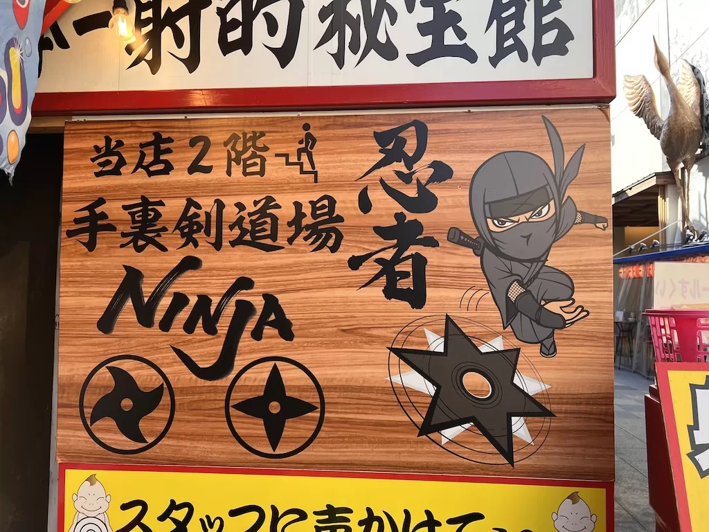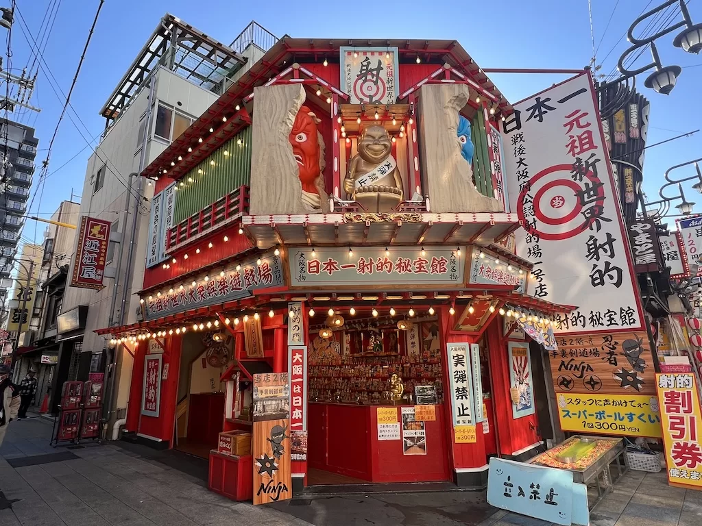 Besides the Tsutenkaku Tower, the stores of Shinsekai feature all kinds of unlikely characters. Needless to say, most of the establishments are restaurants. And then there are the mix and match of arcade types of gaming store with arrow shooting and shuriken throwing.