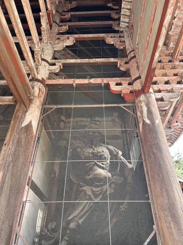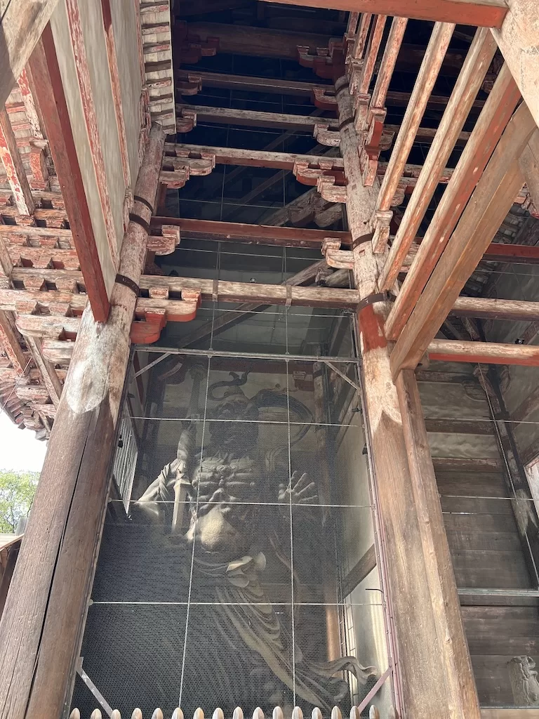 On the way to the Todai-ji Temple I went through the enormous and imposing Nandaimon Gate, also a wooden structure. On the sides of the Nandaimon Gate inside stand two large Nio Guardian Kings. The fierce looking guarding gods are designated national treasures, like the Nandaimon Gate itself.