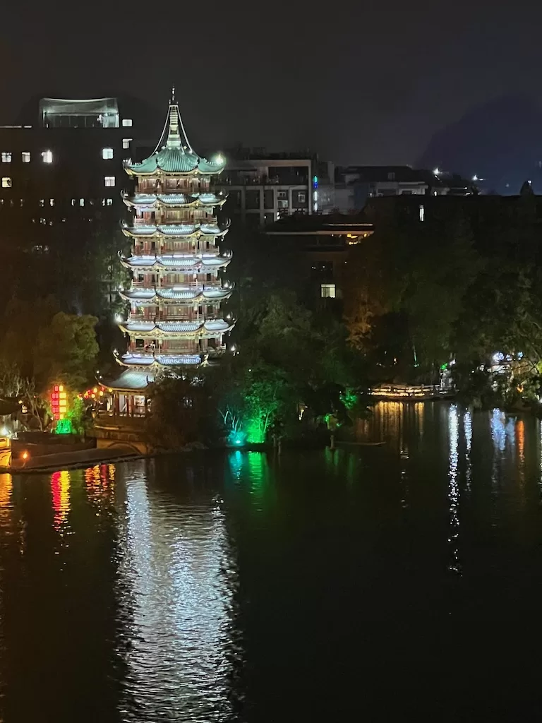 Standing in the Shanhu Lake are two beautiful towers, the Sun Tower and the Moon Tower, that are lit up at night. The Sun Tower glimmers in gold, while the Moon Tower glistens in silver. To visit these twin towers, head on over to the Riyue Shuangta Cultural Park. You may take the elevator up the Sun Tower to see aerial views of Guilin City.