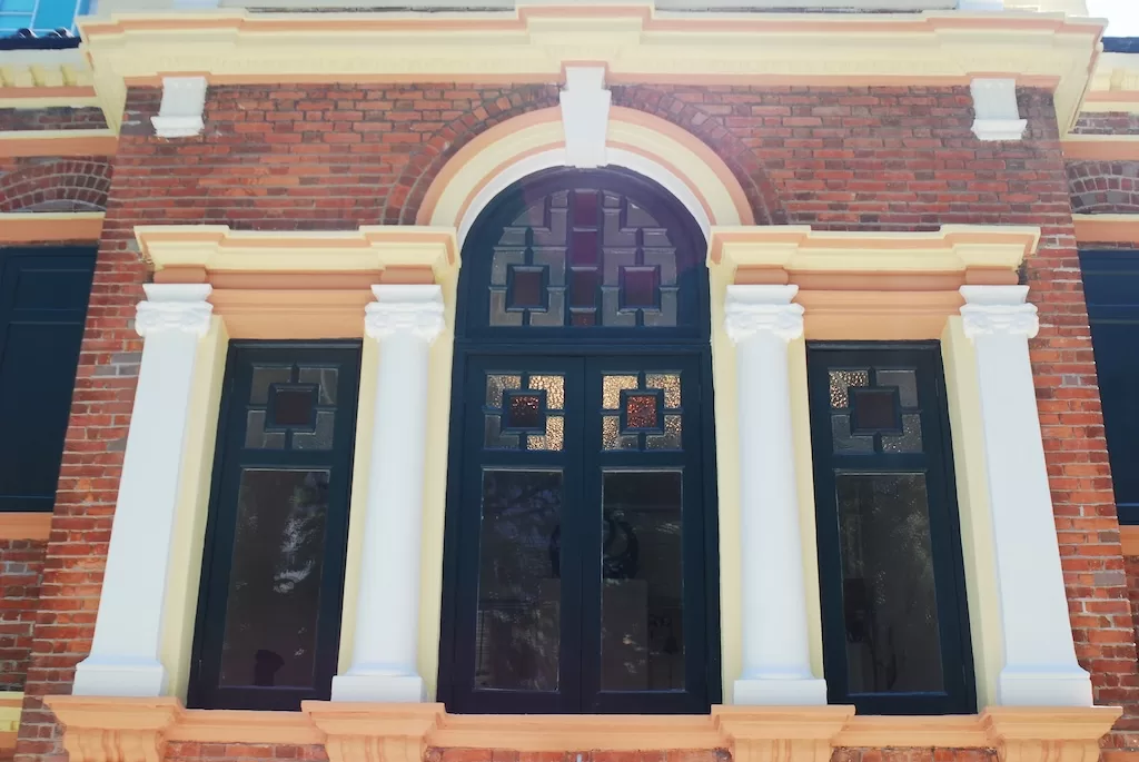 The two-story building comes in the Edwardian style of architecture and a tiled gabled roof. Its exterior lined in red bricks, the building features also arched windows with ornamental lining.