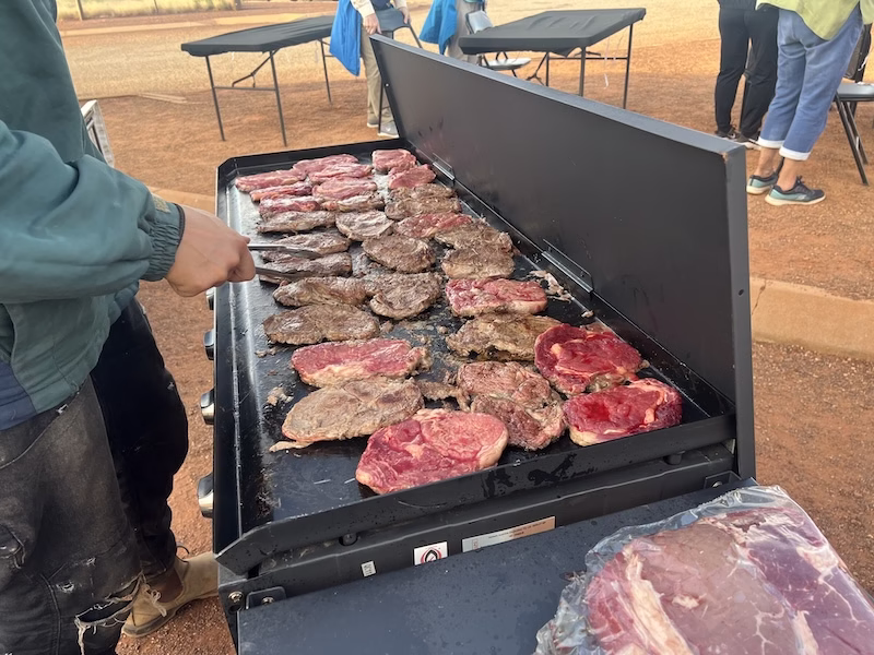 The thought of food came to mind at the Kitchen Cave, and our dinner was half-way aboriginal, as in an open charcoal fire barbecue in a semi wild setting, in a large parking lot facing the monolith afar.