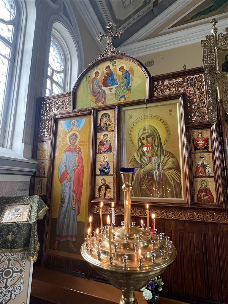 We went on Easter Sunday (on the Gregorian calendar). There was no service, but the church was open and we could tour inside. There were nice stained glass windows throughout and the space was filled with peace. The ceiling was lined with white toned tiles with blue patterns. Many of the relics inside the church showed a golden tone.